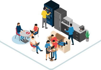 広々としたオフィスルームのほか、共用で使えるコワーキングスペースも完備。